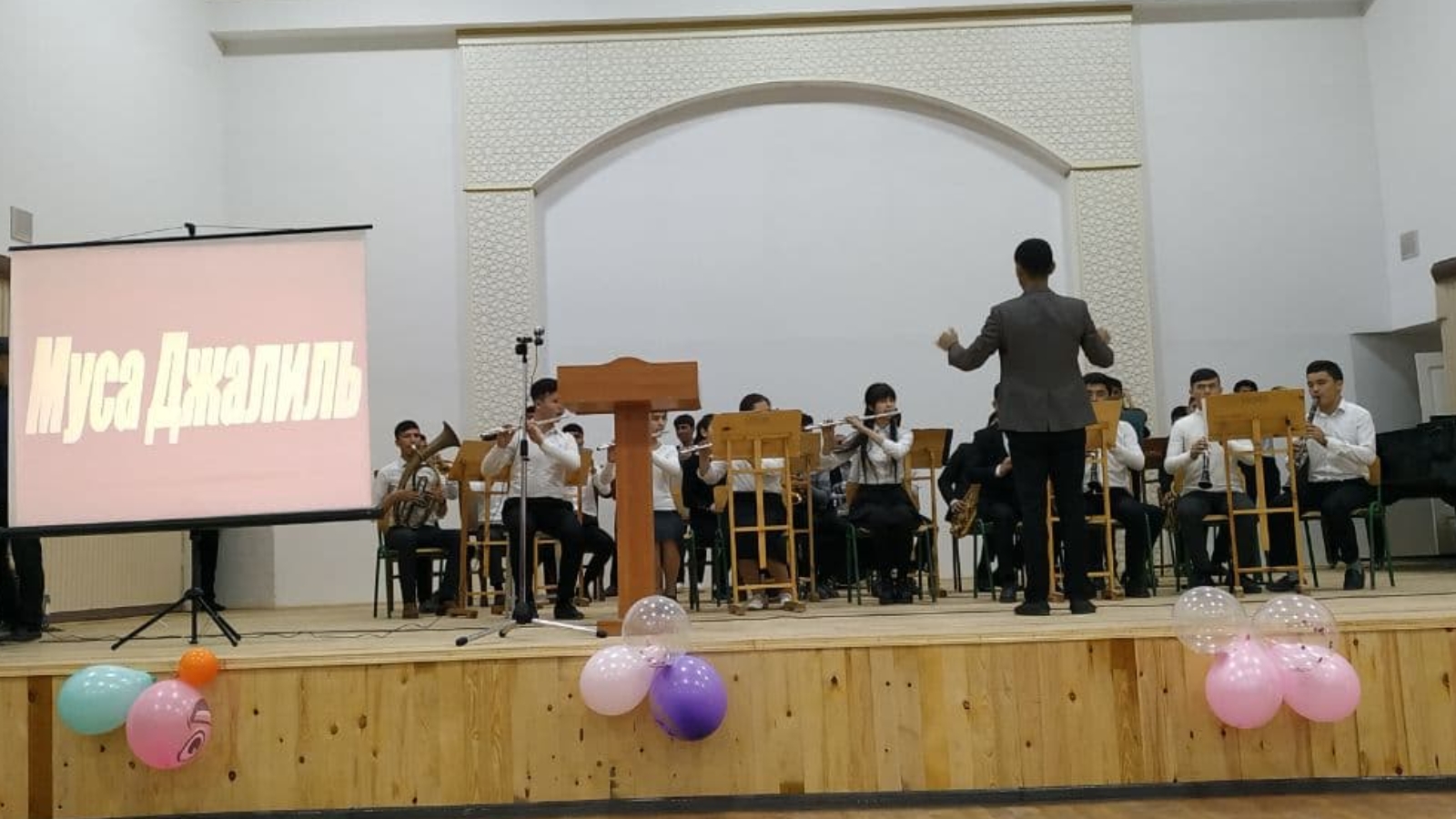 В исполнении духового оркестра Каршинской специализированной школы искусств прозвучал «Гвардейский марш». Участники мероприятия почтили минутой молчания память великого сына татарского народа.