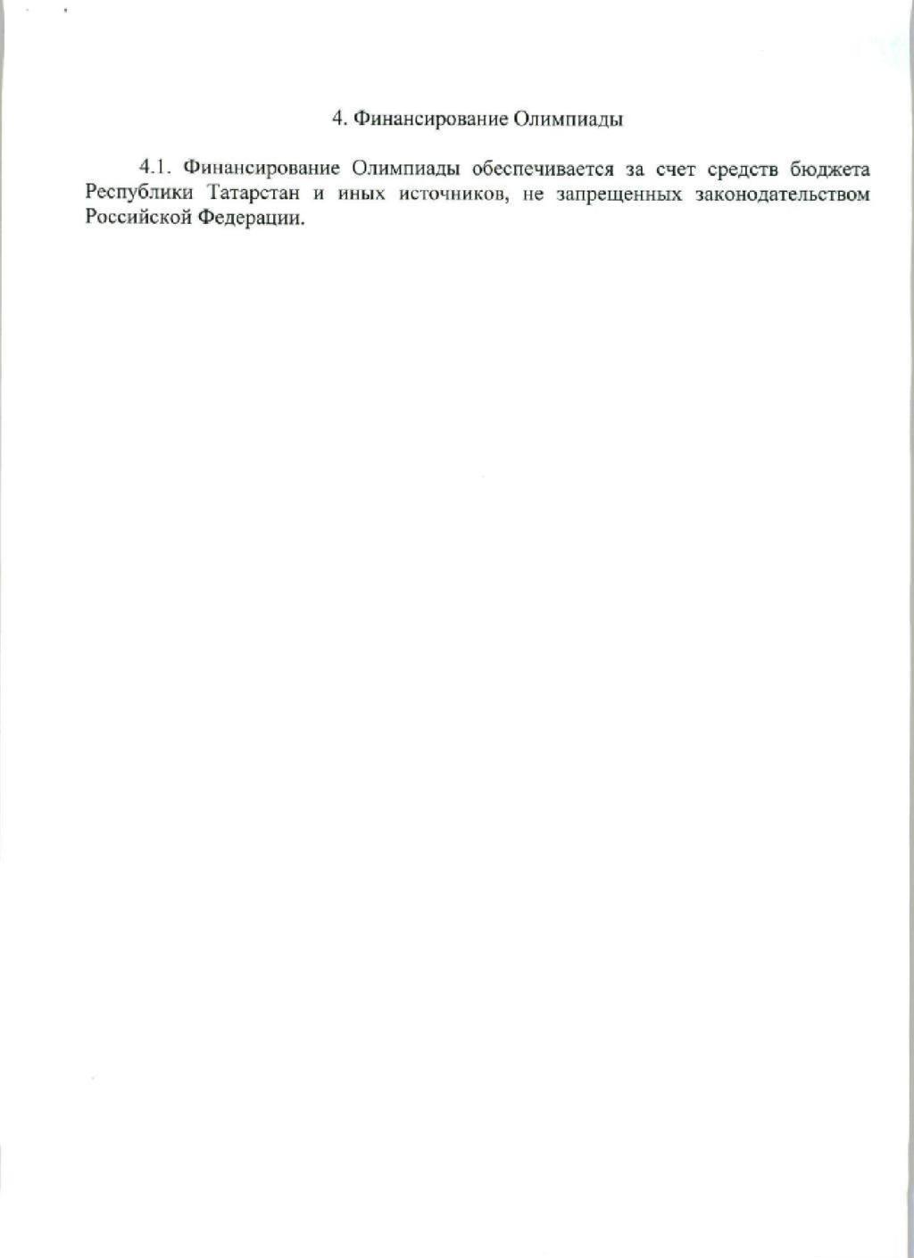 4.1. Финансирование Олимпиады обеспечивается за счет средств бюджета Республики Татарстан и иных источников, не запрещенных законодательством Российской Федерации.